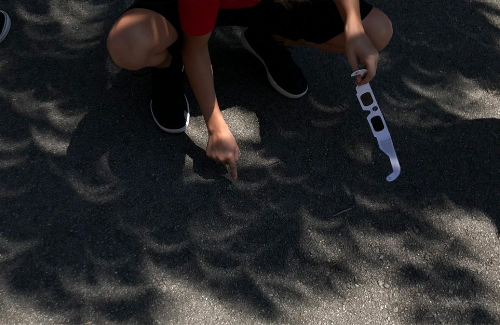 Actually, you don’t even need to make a pinhole viewer—they already exist all around us. If you stand under a tree, the small spaces between the leaves will act as pinholes to project a bunch of little crescent images. Here’s a picture I took during the 2017 eclipse: