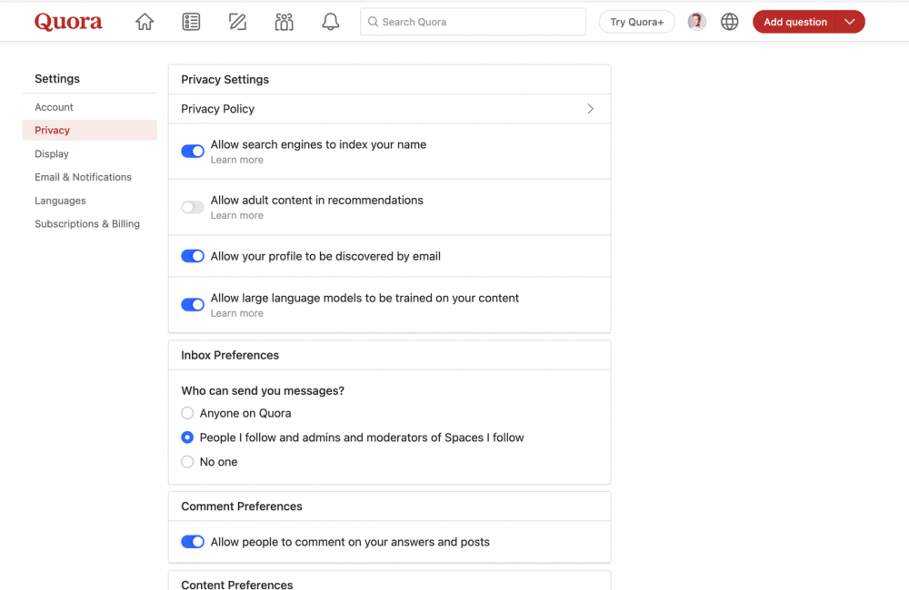 Quora says it “currently” doesn’t use answers to people’s questions, posts, or comments for training AI. It also hasn’t sold any user data for AI training, a spokesperson says. However, it does offer opt-outs in case this changes in the future. To do this, visit its Settings page, click to Privacy, and turn off the “Allow large language models to be trained on your content” option. Despite this choice, there are some Quora posts that may be used for training LLMs. If you reply to a machine-generated answer, the company’s help pages say, then those answers may be used for AI training. It points out that third parties may just scrape its content anyway.