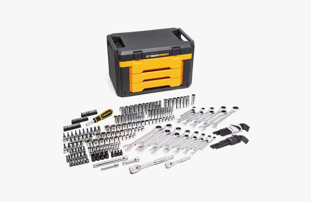 The Gearwrench brand is my favorite entry-to-mid-level tool brand for chrome hand tools. Made in Taiwan, these sockets, combination wrenches, and ratchets have excellent manufacturing tolerances, meaning less slipping off bolt heads and potentially damaging them. This kit only comes with 1/4-inch and 3/8-inch drive sockets and ratchet handles, not 1/2-inch, but that shouldn’t matter unless you’re working on large projects, such as cars’ axle components or building a deck. The organization box is also excellent, with sturdy slide-out drawers and built-in handles that make picking up the heavy box a breeze.
