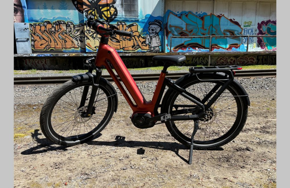 Probably the first thing you’ll notice is the new Bosch system. It has a Bosch Performance Line motor with 85 nm of torque and a 750-Wh ginormous battery integrated into the downtube. After about 45 miles of biking up hills and hauling gear, I only got the battery down to 45 percent. It’s a class 3 ebike with a maximum speed of 28 miles per hour.