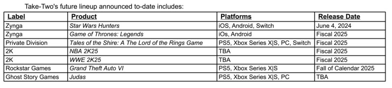 Publisher Take-Two released its 2024 year-end financial report today (thanks, PC Gamer), in which it states that Rockstar is targeting a Fall 2025 release window for GTA VI. This timing is reiterated in a calendar of the publisher’s upcoming releases, posted below.