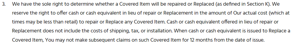 I don’t care for Choice’s many tricky exclusions. For example, Choice could reimburse you for a covered item (which may be less than the retail cost), but Choice doesn’t cover the cost of shipping, tax, or installation when they offer you cash or a cash equivalent for this replacement. You also can’t make claims for 12 months on that replacement, leaving you at risk of your new clothes washer falling and you needing to pay for the repairs out of pocket.