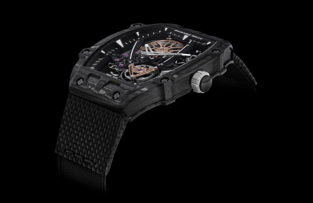 The new RM 27-05 continues the lightweight battle—remove the straps and it comes in at 11.5 grams. This is thanks in part to the monoblock case made of Carbon TPT B.4, a material previously used in Formula 1 race cars. Compared to normal Carbon TPT, B.4 is denser, the fibers are stiffer, and the resin is around 30 percent tougher. What does this mean? Thinner pieces can be machined, so you get weight reduction without losing rigidity. The manual movement inside has been shaved down to be lighter, too, and is 0.6 millimeters thinner.