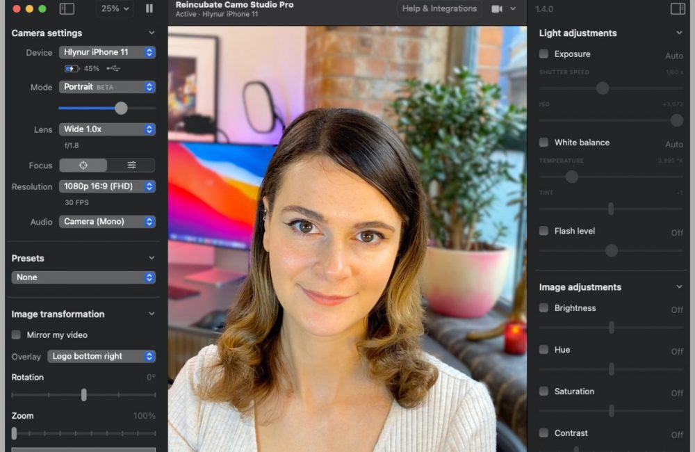 You get quite a few options to choose from in the Camo desktop app to customize the video feed. That includes 720p video quality and zoom options, and you can remove the watermark. Much of this is free, but unfortunately, you’ll need to pay for Camo Pro for several nifty features, like 4K recording, the ability to switch lenses, and Portrait mode (iPhone owners are likely better off using Apple’s Continuity Camera, which we detail further below). Camo offers a few payment options: a lifetime license ($100), an annual subscription ($50), or a monthly subscription ($9).