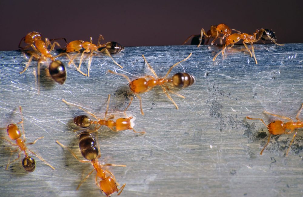 One of the species is the Pharaoh ant. These tiny reddish-orange bugs can build a nest in just about any void space. They do this by building the nest out of their own saliva, so they don’t need any other medium.