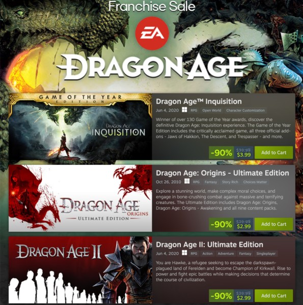 Steam launched a Dragon Age franchise sale yesterday, with a 90% discount on all three games in the series. Here’s the prices for each and the order to play them in if you want to start at the beginning: