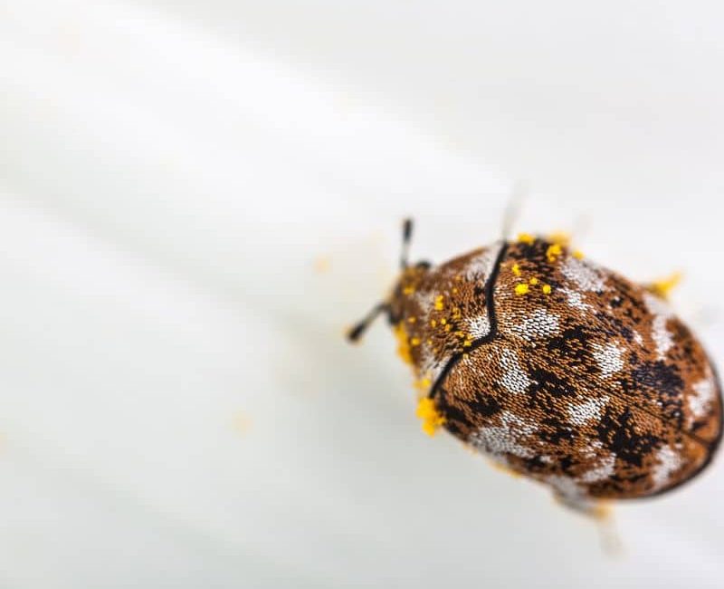 Carpet beetles, or by their scientific name Anthrenus verbasci, are small — one-sixteenth of an inch — round insects that commonly infest homes. They have dark brown or black bodies with mottled splotches of red, pale, or orange coloration. These pests consume natural fibers like silk, wool, cotton, fur, leather, and feathers. They’re known for infesting homes in the fall and winter and causing significant damage to carpets and clothing.