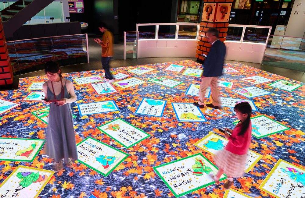 The first floor of the museum is dominated by an exhibit where you can experience new interactive content, newly created just for the museum, that’s based on older Nintendo products. There’s a giant version of a card game based on Hyakunin Isshu, a set of 100 historical Japanese poems, that takes over an entire room. Players open a dedicated app which reads aloud the first verse of one of the poems. Then the players have to wander around the room where giant cards are scattered on the floor to find the corresponding card that continues the poem they just heard.