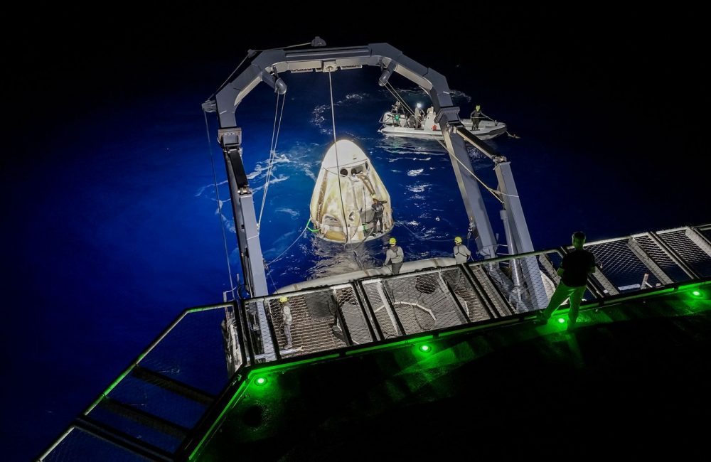 The darkened waters there were carefully chosen from among dozens of potential landing spots near Florida. This is because the wind and seas were predicted to be especially calm and serene as the Crew Dragon spacecraft named Resilience floated down to the sea and bobbed gently, awaiting the arrival of a recovery ship.