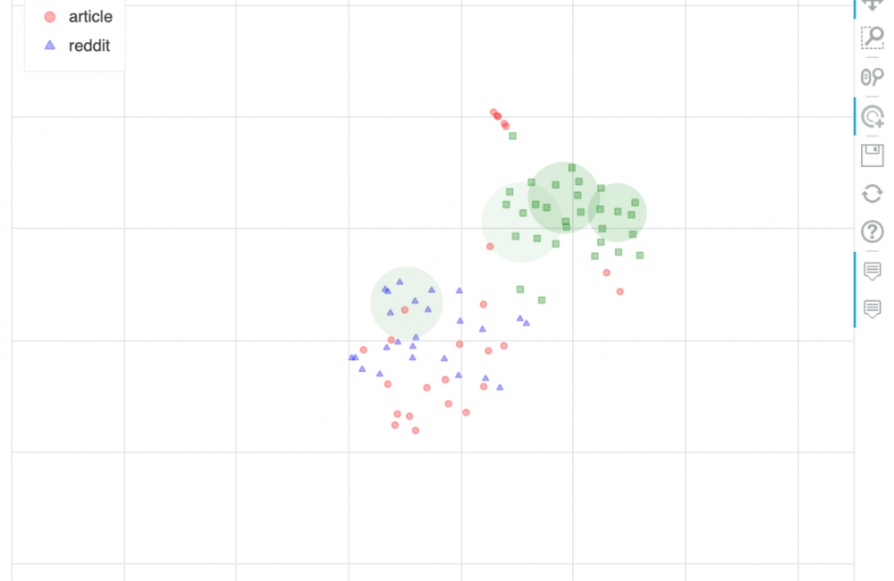 Using another word embedding of Reddit threads as well as a Google News search, the coders created a visualization that shows research papers along with Reddit discussions and relevant news reports.