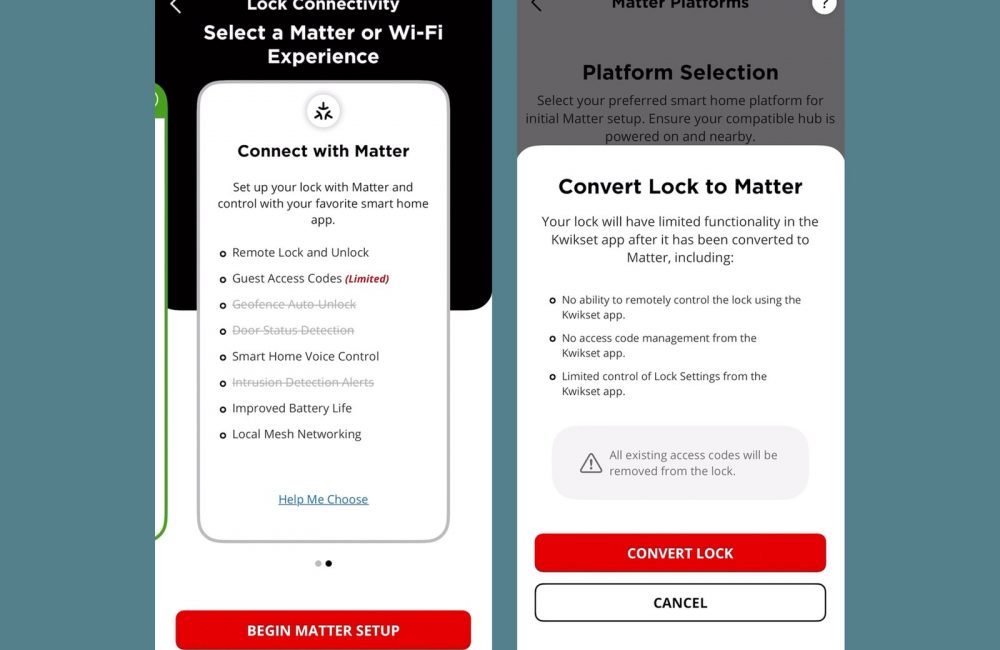 The Kwikset app will also make it easy to switch back control to Kwikset and Wi-Fi if you decide Matter isn’t for you. There are more features available if you choose the Kwikset-controlled path, like guest codes and using the included door-status sensor, but the lock does promise better battery life when using Matter.