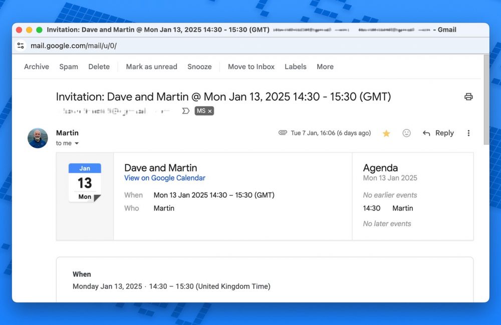 The majority of Google Calendar scams involve links to fraudulent websites designed to trick you out of personal details: The classic digital con. These links can either be embedded in Google Calendar event descriptions, or in emails purporting to be Google Calendar invites: In both cases, a lot of care will be taken to make the links appear normal and genuine.