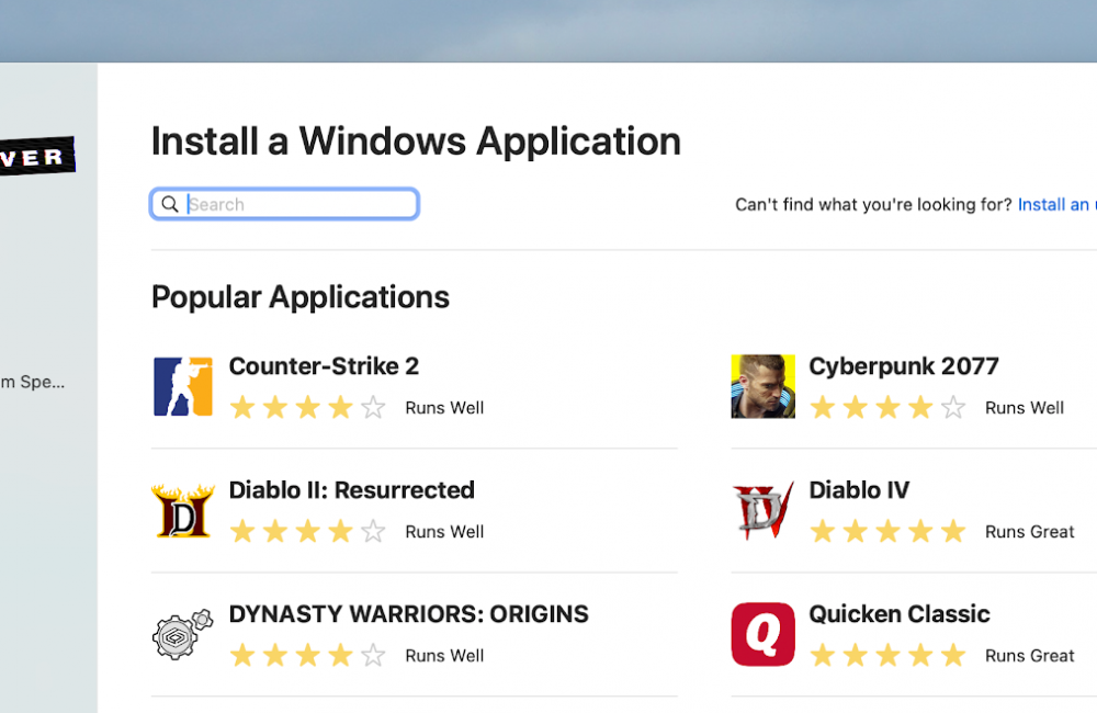 CrossOver Mac is a $74 program that can run Windows applications. You can search for any game, and a lot of software, right in the user interface and get a guided installation process. This means anything your game needs in order to run properly is downloaded and configured for you. CrossOver is expensive, yes, but this guided approach could save you a lot of time compared to the free options. It’s also nice having the ratings for how well the games work right in the application itself, instead of having to research anything yourself.