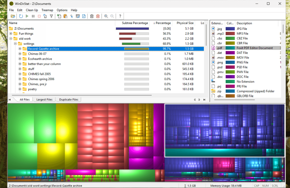WinDirStat is a free and open-source application for Windows that can scan any directory, even your entire hard drive, and present a visual breakdown of all the files. Just launch the application, select the folder you want to scan, then watch the little Pac-Man inspired animation until you’ve got a complete map of your drive.