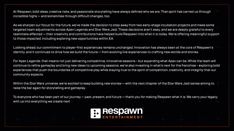 “These decisions aren’t easy, and we are deeply grateful to every teammate affected – their creativity and contributions have helped build Respawn into what it is today. We’re offering meaningful support to those impacted, including exploring new opportunities within EA.”