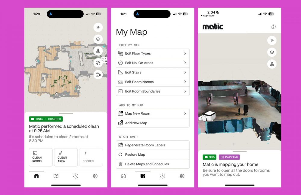 The app has several buttons that you can toggle. You can change the rendering style to make the map less visually cluttered; you can use a joystick to control the vacuum manually; you can switch to an “airplane mode” to “fly” through your house at eye level, instead of at floor level; and you can record video if you have errors to send to Matic’s team.