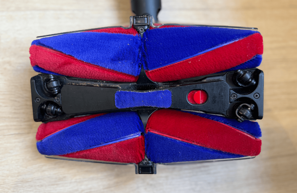Attached to the PencilVac are four conical brush bars called Fluffycones. With two brush bars on each side, the front cone rotates in one direction while the rear brush goes the opposite way. The four bars jut out at the sides too; that way, it cleans in all directions with every pass on the floor.