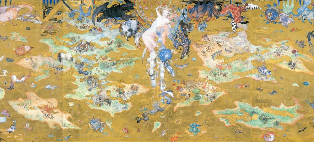 When Yoshitaka Amano, illustrator and concept artist for the series, was brought on to start the process of bringing the world to life, he began with something unconventional. When Ishii came to visit for a meeting early in the development cycle, he found Amano with four massive sheets of paper laid out in the studio – a combined width of twelve feet. Amano was painting a world map. The final product, a sprawling and striking image depicting the geography of Vana’Diel intermixed with its fauna and mythological beings, references traditional Japanese illustrated scrolls and folding screens like the Rakuchu Rakugai-zu. Amano’s art is always evocative in ways the games it informs cannot convey, but his map of Vana’Diel had a grandeur and subtlety unique even to his body of work. More than an illustration for a game, it seems to be a classical work plucked from the world of Final Fantasy itself. To Amano, who was overwhelmed by Ishii’s vision and sense of place, it may as well have been.