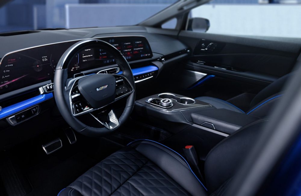 Interior space for four is generous, and while it may be a “compact” SUV in North American terms, three people can ride in the rear seat without hating each other. Like all GM’s EVs below the big trucks, there’s no front trunk. That’s a missed bet. It also lacks a rear wiper; Cadillac claims the airflow through its “rear flow-through spoiler channels high-velocity air” to keep the rear window clean. Sloppy spring rainstorms in upstate New York beg to differ. Cadillac also suggests using the video rear-view mirror as an alternative to glass you can actually see through.