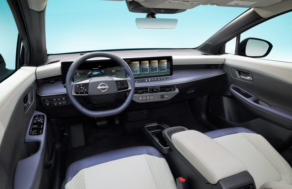 Stylistically, the Leaf resembles a smaller Nissan Ariya—the brand’s larger EV crossover. The new Leaf, however, is sleeker—Nissan quotes a drag coefficient of 0.26, down from the prior Leaf’s 0.29 and the Ariya’s 0.297—and uses such drag-reducing features as the company’s first powered, flush-fitting front door handles (the rears are scooped out of the roof pillar behind the rear doors). The very high tail provides a large cargo area, at up to 55.5 cubic feet (1.6 cubic meters) behind the rear seats.