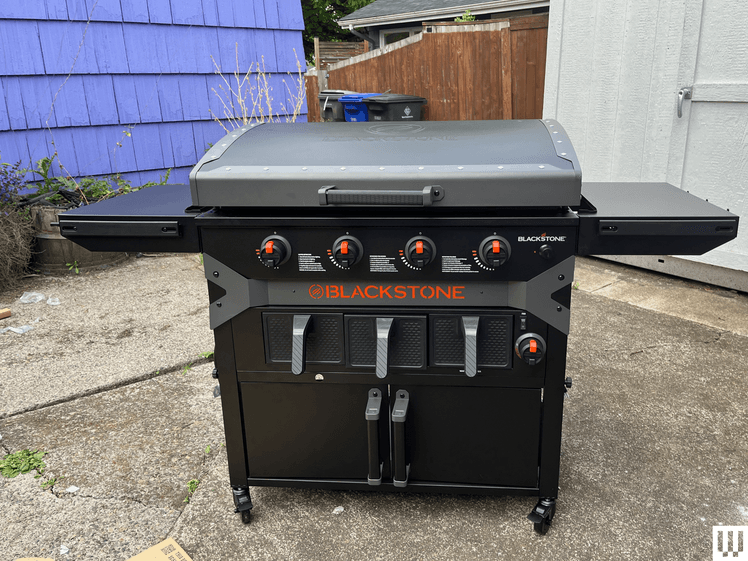This Blackstone Iron Forged Air Fryer Combo comes with two air frying baskets and a third warming basket underneath the griddle. Well, guess what? If you don’t turn on the air fryer fan, that means you’ve got three big warmer baskets, ready to make hot dog buns all toasty and nice. I haven’t tested this claim, but Blackstone swears you can fit and cook 126 hot dogs across this griddle plate, for you and 125 of your closest friends.