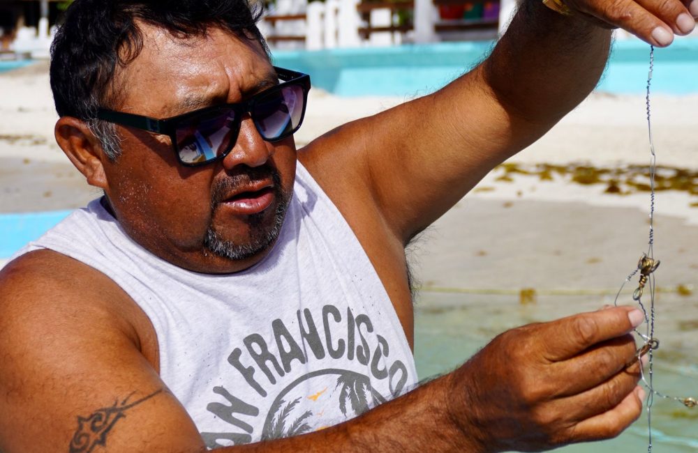 Handline fishing is a traditional method that has long been used in the shallow waters near Puerto Morelos. It consists simply of a line and a hook, and can be used to catch fish such as croaker, which can be eaten but have little commercial value. Two other methods are used to catch more valuable species. A línea de rosario (“rosary line”) consists of multiple lines with a series of branched hooks, and is used in deeper waters, about 20 nautical miles from the coast. It is used to catch snapper, grouper, and pigfish. Lobster is caught by free divers using spearguns.