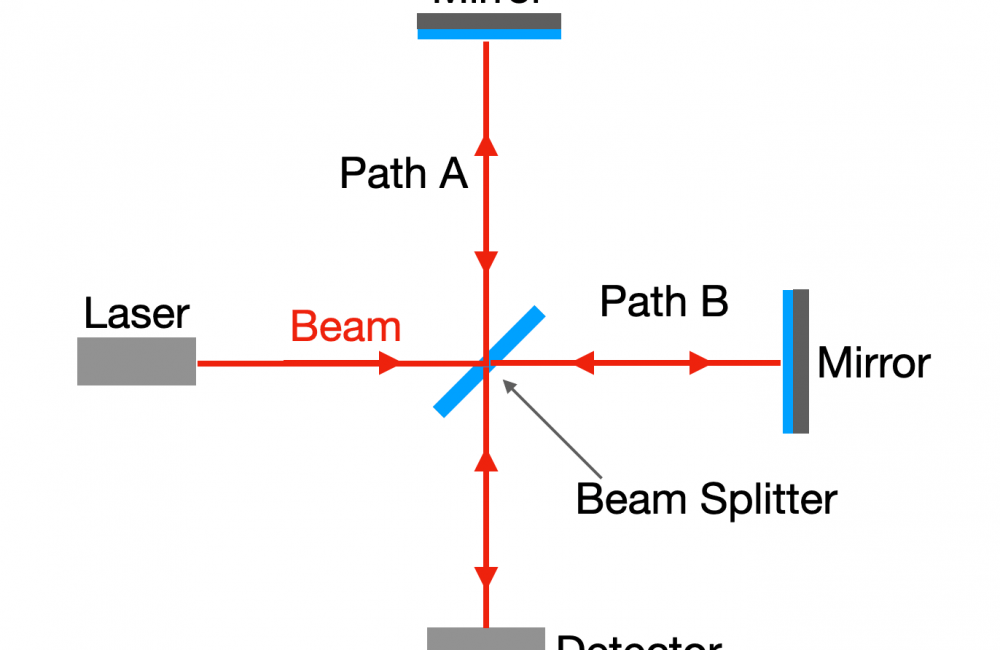 In 1887, Albert Michelson and Edward Morley devised a clever experiment to detect this aether. They built a device called an interferometer, which split a beam of light in half and sent the halves along two paths of equal length, bouncing off mirrors, and merging again at a detector, like this: