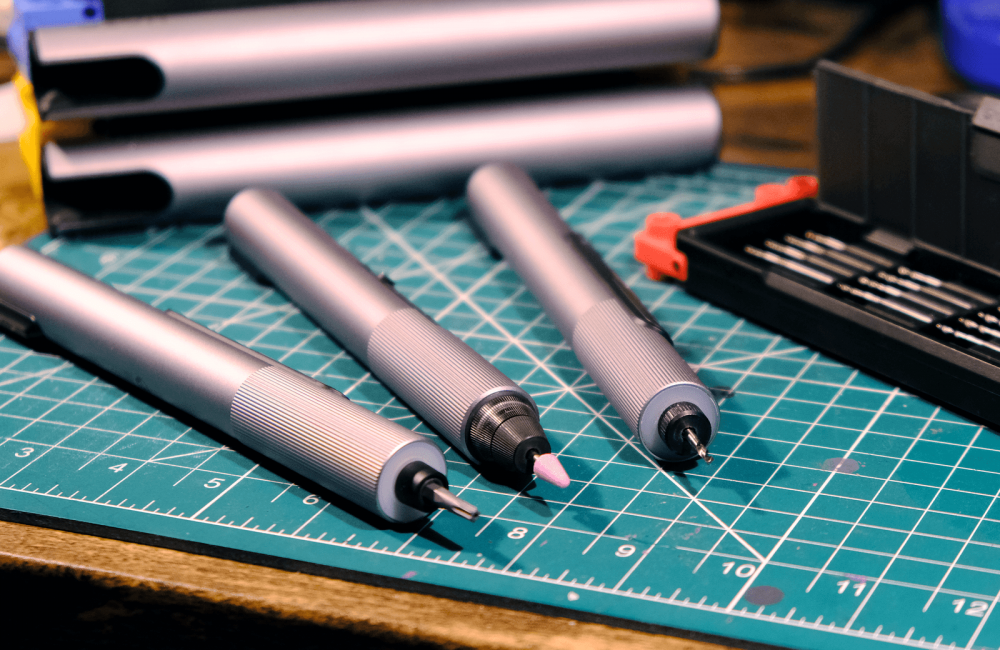 All three tools have an anodized aluminum outer housing with a plastic back plate. They feel fairly durable, being able to withstand basic drops without any damage, and weigh around 100 grams each. The grip areas have straight knurling to improve grip, and the buttons are a flexible rubberized panel with small switches underneath. There are no seams surrounding the buttons where dust or particles can become embedded, useful for tools that will likely create small, airborne particles.