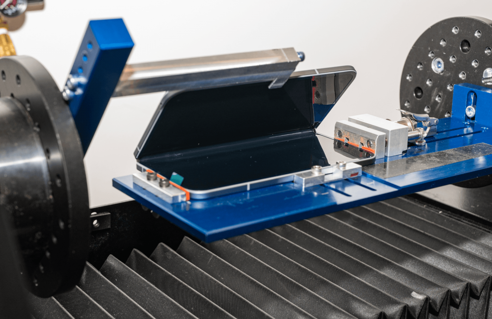 Next up are a few wear tests. The first was a mannequin’s arm wearing the Pixel Watch 4, bolted to a robot arm that moved back and forth. The watch’s band was resting on a piece of wood, and the test measured how well the strap fared when rubbing against the material. (It’s easy to switch the material it rubs against to something else, like a metal sheet.) It’s a surface abrasion test Google runs to test new strap types for its smartwatches; a pressure sensor applies consistent force for accurate measurements.