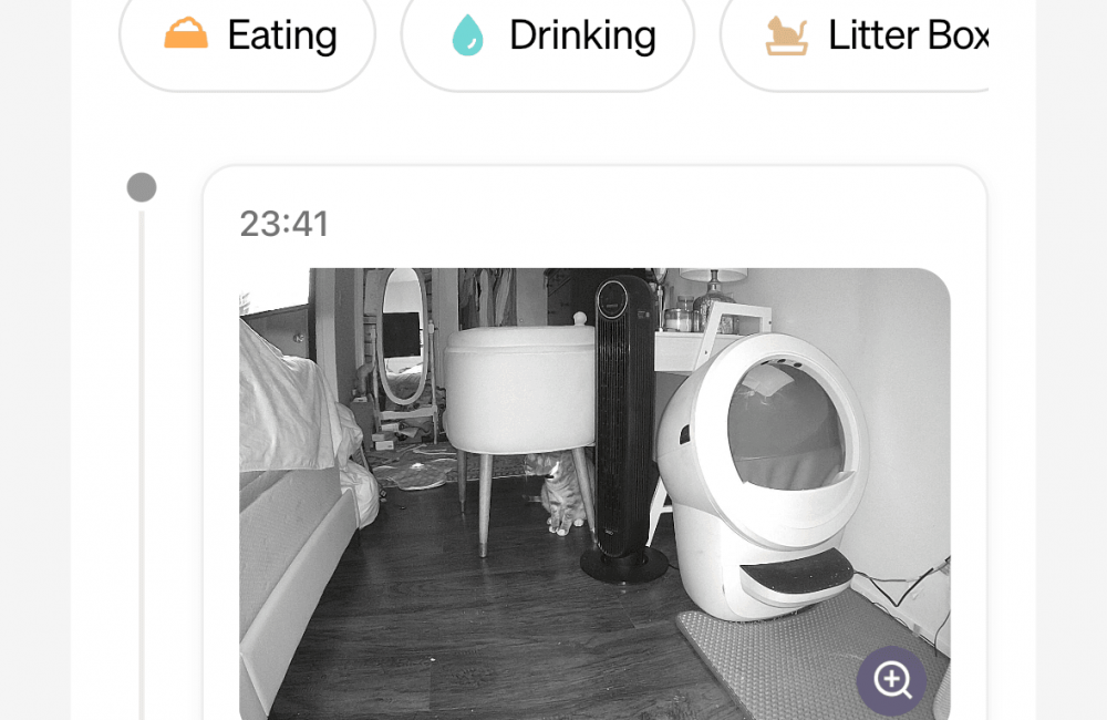 In much of the pet tech I test, the connected apps are lacking. But that’s not been the case with anything I’ve tested from Petlibro. Through the app, you can view live footage, watch clips organized by day, pet, and activity, and review 30-second highlight reels of each day. Activities are organized by pet and categorized by type: Eating, Drinking, Litter Box, Selfie, Motion, and Other (which was usually just my cats lounging on the bed). You can also easily send feedback about each pet and behavior with a click of a button, so the AI can learn to correctly label each pet and behavior.