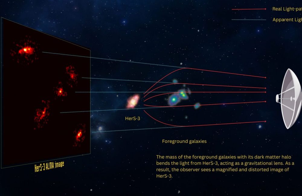 At first glance, the Einstein’s cross of HerS-3 appears to have been created solely by gravitational lensing generated by the four giant galaxies located between HerS-3 and Earth. However, using a precise model of gravitational lensing, the team found that the observable mass of these four giant galaxies is insufficient to explain the arrangement of the five images of the cross: their mass is simply not great enough to produce the visual effect seen.