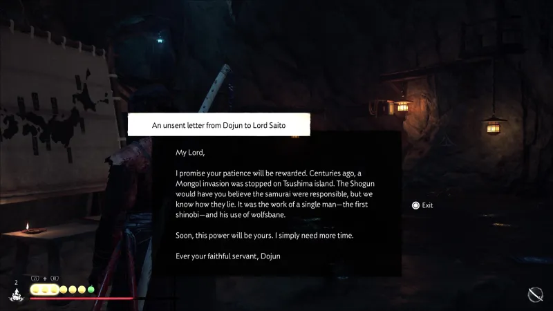 The first appearance of Tsushima I found comes from a document while Atsu is pursuing one of the Yōtei Six, the Kitsune. In a cave belonging to the Nine Tails, the organization the Kitsune runs, Atsu finds some paperwork about the group’s intention to create wolfsbane.