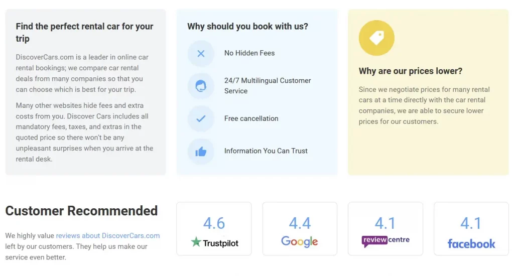 But don’t just take our word for it! Our satisfied customers speak for themselves. Discover Cars boasts an exceptional TrustPilot rating, a testament to the outstanding service and unforgettable experiences we provide. Users rave about the user-friendly platform, transparent pricing, and the diverse range of vehicles available, ensuring there’s something for every type of traveler.