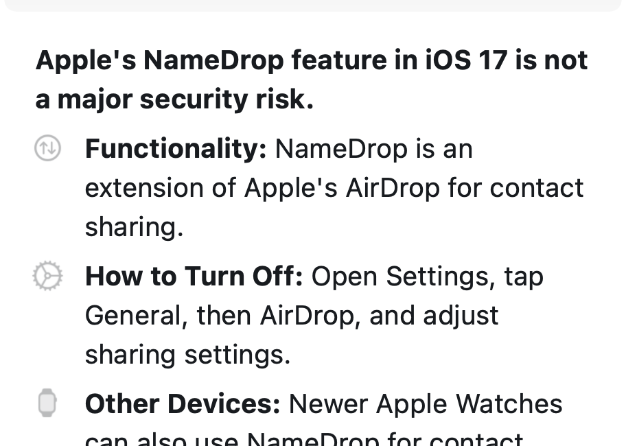 That brings us to a critical question: What can these AI tools actually do in browsers? Well, in its first week, Arc Max users created over a million summaries using generative AI to see previews of hyperlinked information as they’re searching the internet, before clicking on the web page. For example, I searched for “namedrop apple” in Google and hovered the cursor over my article about this new iOS 17 feature. Here’s the web page summary created by AI: