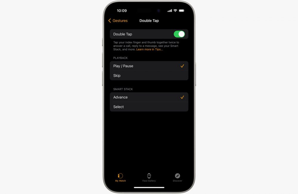 To check if your watch is running it, open Settings > Gestures > Double Tap to enable or disable it. In the Double Tap menu, you can select if you want Double Tap to play/pause your music or skip, and whether you want Double Tap to advance your Smart Stack or select.