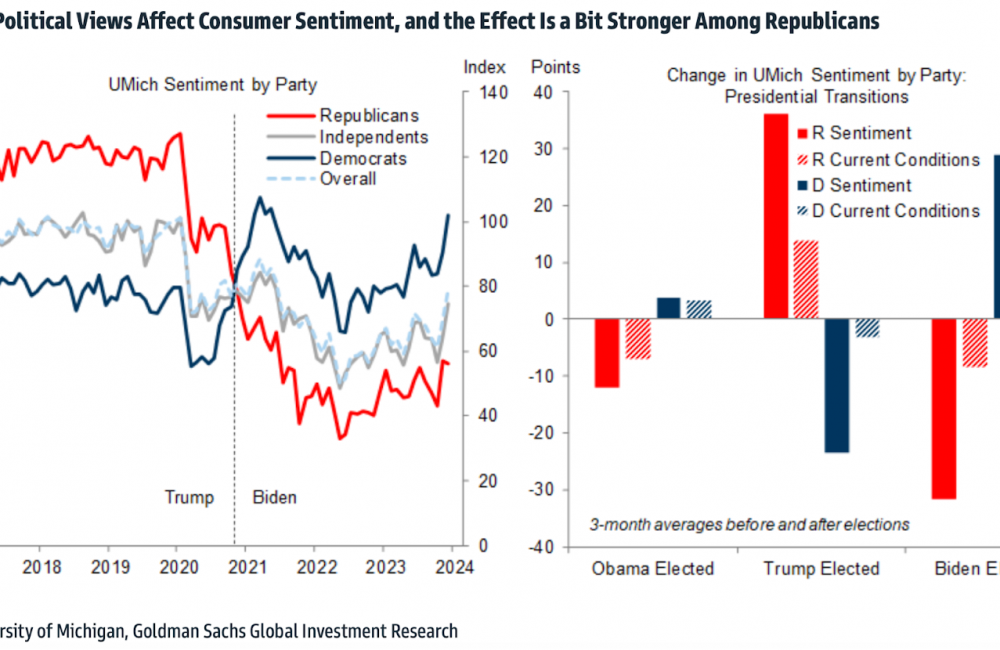 “Confidence tends to drop off sharply among supporters of both parties when control of the White House switches to the party they oppose, but the effect appears to be somewhat stronger among Republicans in recent elections,” the Goldman team wrote, sharing a chart with their findings about U.S. post-election consumer sentiment drops.