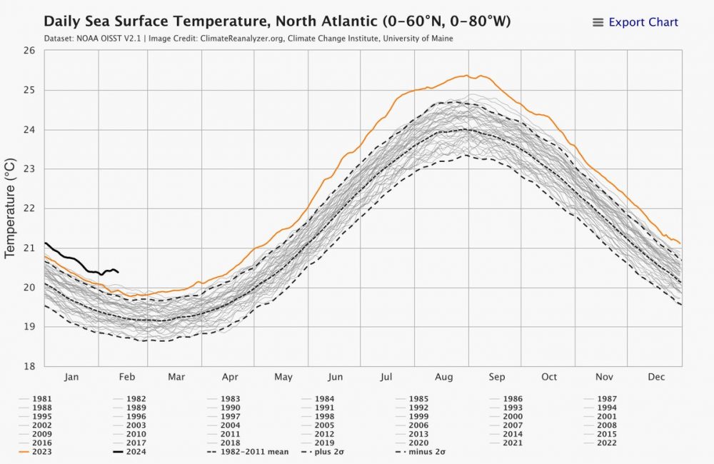 In addition to plankton dealing with ever-higher temperatures due to global warming, there’s also natural variability to consider here. Less dust has been blowing off the Sahara Desert recently, for example. Normally this plume wafts over to the Americas, forming a giant umbrella that shades all that Atlantic water. But now the umbrella has partially folded up, allowing more of the sun to beat down on the ocean.