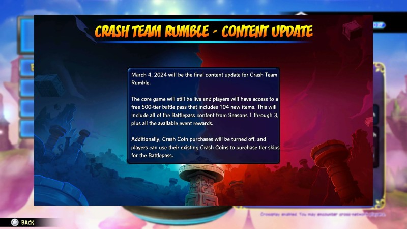 Players who boot up the game have been greeted with a message, posted below, announcing that on March 4, Crash Team Rumble will get its last content drop. The game is not shutting down, though. The base experience will remain live and players will have access to a free 500-tier battle pass. This includes 104 new items from all content across Seasons 1 through 3 and all available event rewards. Developer Toys for Bob has also disabled Crash Coin purchases, and players can use any remaining coins to buy battle pass tier skips.