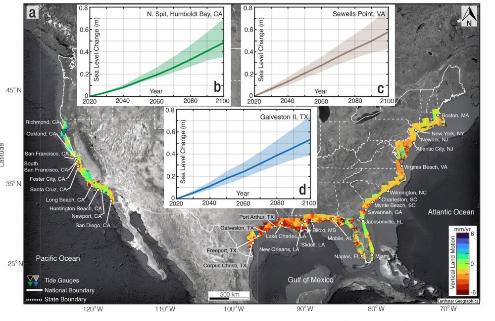 An alarming new study in the journal Nature shows how bad the problem could get in 32 coastal cities in the United States. Previous projections have studied geocentric sea-level rise, or how much the ocean is coming up along a given coastline. This new research considers relative sea-level rise, which also includes the vertical motion of the land. That’s possible thanks to new data from satellites that can measure elevation changes on very fine scales along coastlines.