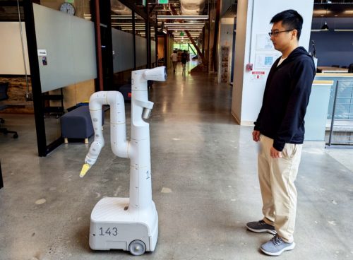 In a cluttered open-plan office in Mountain View, California, a tall and slender wheeled...